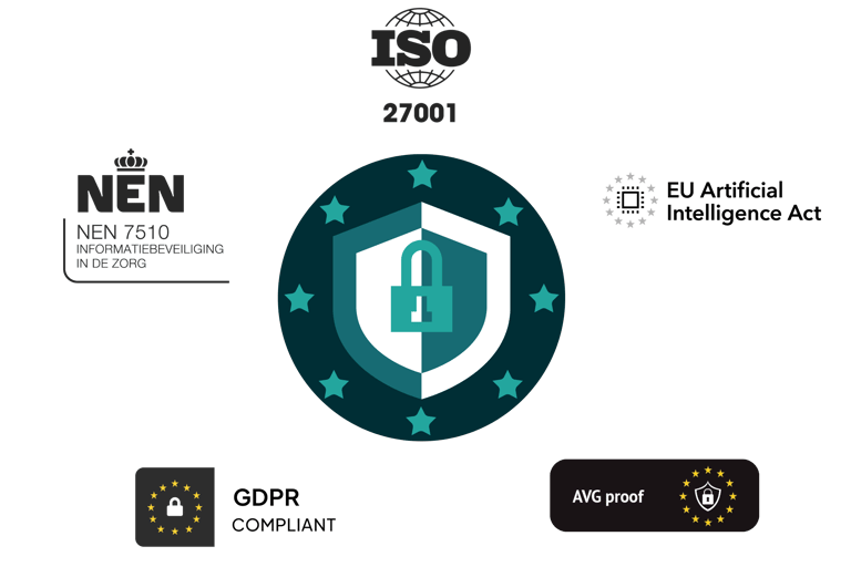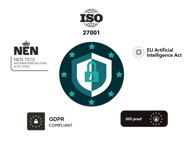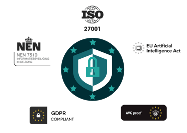 We werken volgens de richtlijnen van de NEN-7510 en ISO-27001, AI-act en MDR. Meer informatie over ons dataverwerkingsbeleid?