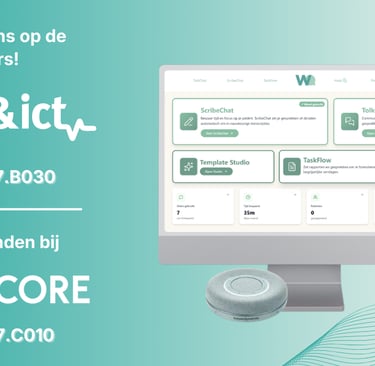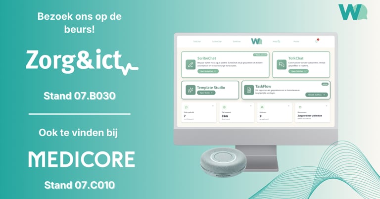 Op dinsdag 14, 15 en 16 april staan wij op Zorg & ict beurs en ben je van harte welkom om 𝗸𝗲𝗻𝗻𝗶𝘀 𝗺𝗲𝘁 𝗼𝗻𝘀 𝘁𝗲 𝗺𝗮𝗸𝗲𝗻, vragen te stellen en onze speech-to-text oplossing 𝗹𝗶𝘃𝗲 𝘁𝗲 𝗯𝗲𝗸𝗶𝗷𝗸𝗲𝗻 𝗲𝗻 𝘂𝗶𝘁 𝘁𝗲 𝗽𝗿𝗼𝗯𝗲𝗿𝗲𝗻. We laten je graag zien hoe spraakherkenning zorgprofessionals helpt om efficiënter te werken.