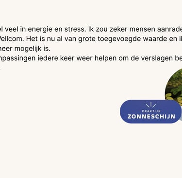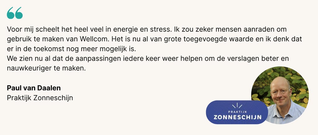 Voor mij scheelt het heel veel in energie en stress. Ik zou zeker mensen aanraden om gebruik te maken van Wellcom het is nu al van grote toegevoegde waarde en ik denk dat er in de toekomst nog meer mogelijk is. We zien nu al dat de aanpassingen iedere keer weer helpen om de verslagen beter en nauwkeuriger te maken.