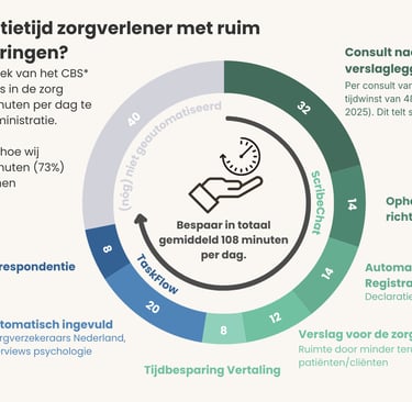 Momenteel maakt onze software 𝗴𝗲𝗺𝗶𝗱𝗱𝗲𝗹𝗱 𝟭𝟬𝟴 𝗺𝗶𝗻𝘂𝘁𝗲𝗻 𝗽𝗲𝗿 𝗱𝗮𝗴 𝘃𝗿𝗶𝗷 voor zorgverleners door administratieve taken te automatiseren, met spraak-naar-tekst technologie als motorblok. Niet om nog meer patiënten/cliënten te zien, maar om meer aandacht te kunnen geven aan de patiënt die voor je zit, beter te kunnen luisteren en zo betere zorg te leveren. 🩺